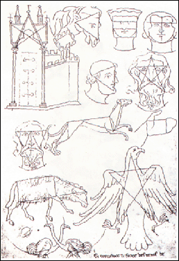 이런 기법은 단순히 상징적 이유만이 아니라 실용적인 편의성도 있었습니다. 기하학적 프레임을 익히면 그림 실력이 부족한 사람도 일정한 형태를 손쉽게 만들어낼 수 있었던 경우 있으니까요. 따라서 오네쿠르의 앨범은 제작적 비례에 따라 만들어진 이미지이기 때문에 '소묘' 라기보다는 '구성' 에 더 가깝고, 이는 오늘날의 그래픽 디자이너들의 도안집에 가깝다고 할 수 있습니다.