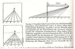 실은 '올바른 구축'에 대한 알베르티의 설명은 그다지 명확하지 않아 크게 세 가지 상이한 해석이 존재합니다. 그중에서 파노프스키의 설명에 따르면, 올바른 구축은 다음과 같은 방식으로 만들어집니다. 먼저 화면에서 시각 피라미드의 정점에 대응하는 중심점을 정하고, 그로부터 같은 간격으로 늘어선 밑변의 점들(a, b, c, d, e, f)까지 직선을 연결합니다. 여기에 횡선을 그어야 하는데, 문제는 그 횡선들의 간격을 어떤 비율로 단축해 나가느냐 하는 것입니다.